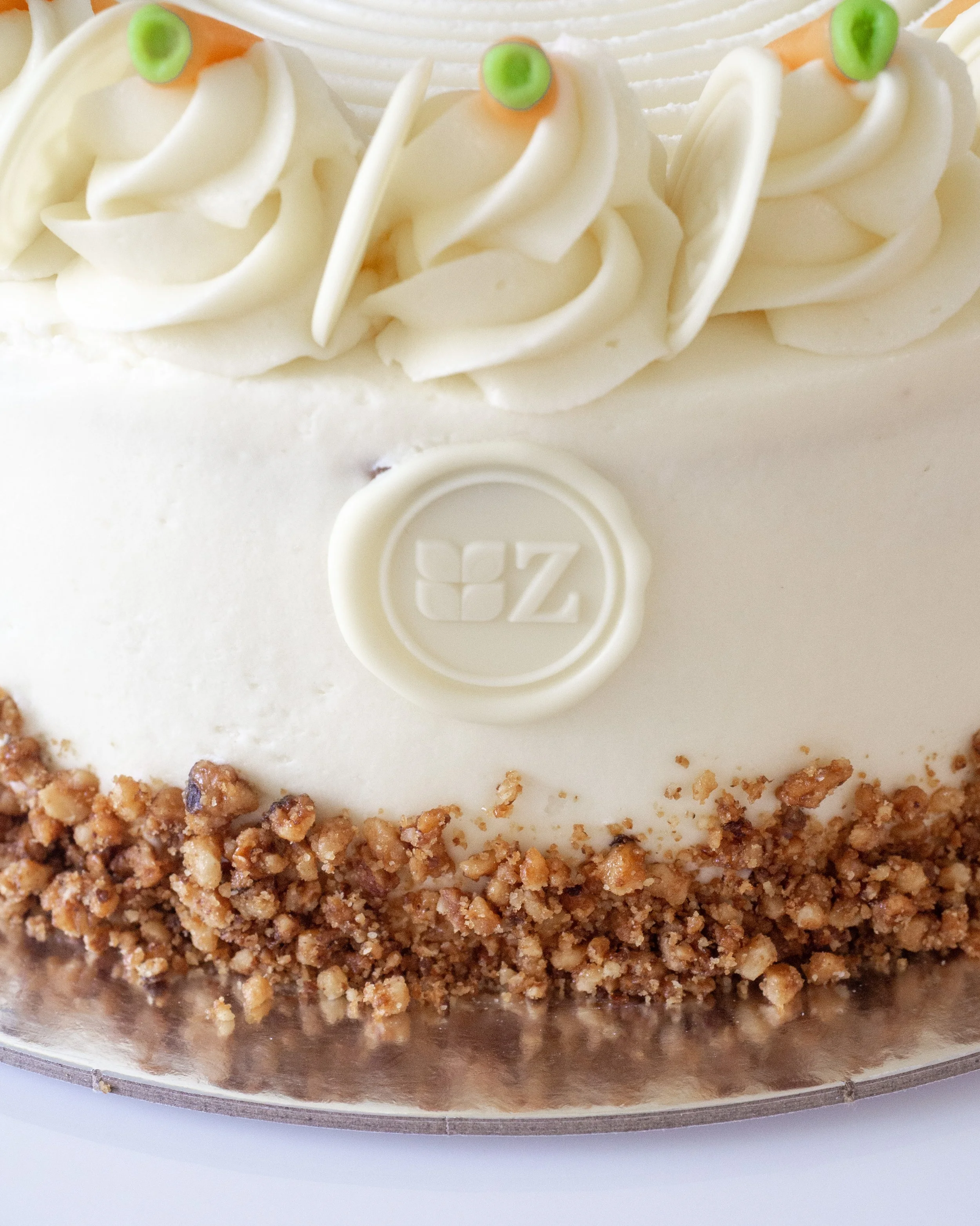 Claimed by many countries as their own, our Carrot Cake combines the best parts of the traditional Australian/American recipe with elements of the Swiss Rüeblitorte. Spiced with cinnamon and ginger, and full of walnut and sultanas, the two layers of cake are separated by a layer of orangey cream cheese filling, and decorated on top with more cream cheese icing and home-made mini marzipan carrots.